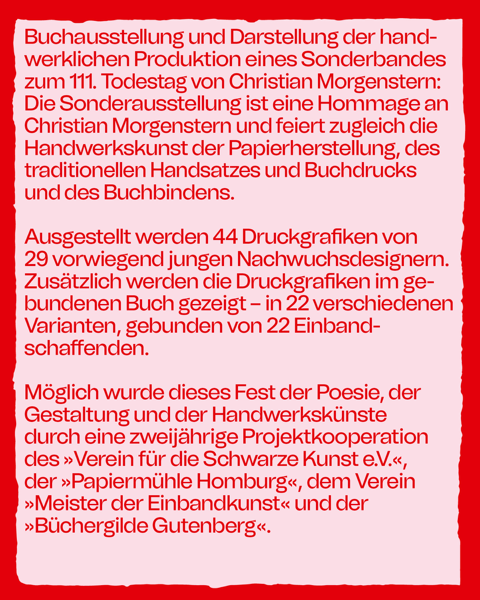 Mein Morgenstern – 120 Hände und ein 111. Todestag — Von Hand geschöpft, gesetzt, gedruckt, gebunden. 30. Mai bis 30. August 2025 in Dresden, Zentralbibliothek des Kulturpalastes